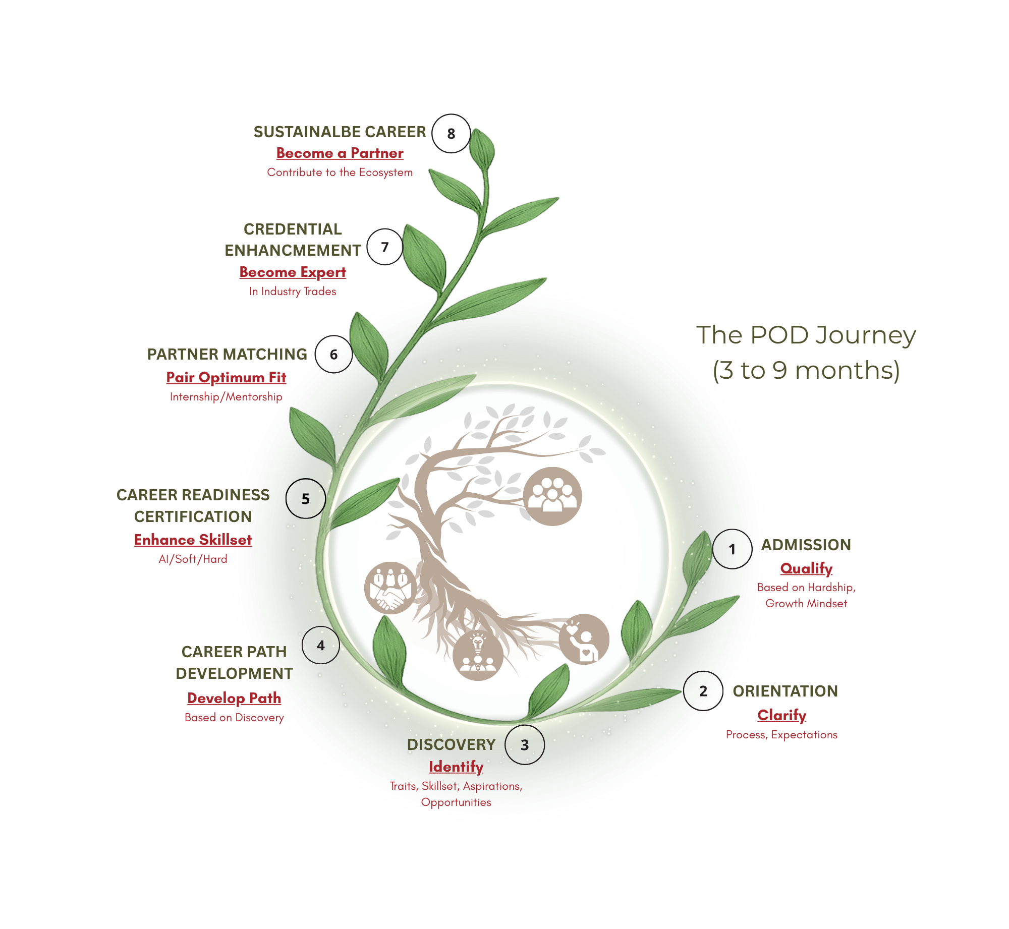The POD (Professional Opportunity Development) process is a structured journey that nurtures confidence, skill mastery, and purpose, helping individuals grow into strong, employable talent.