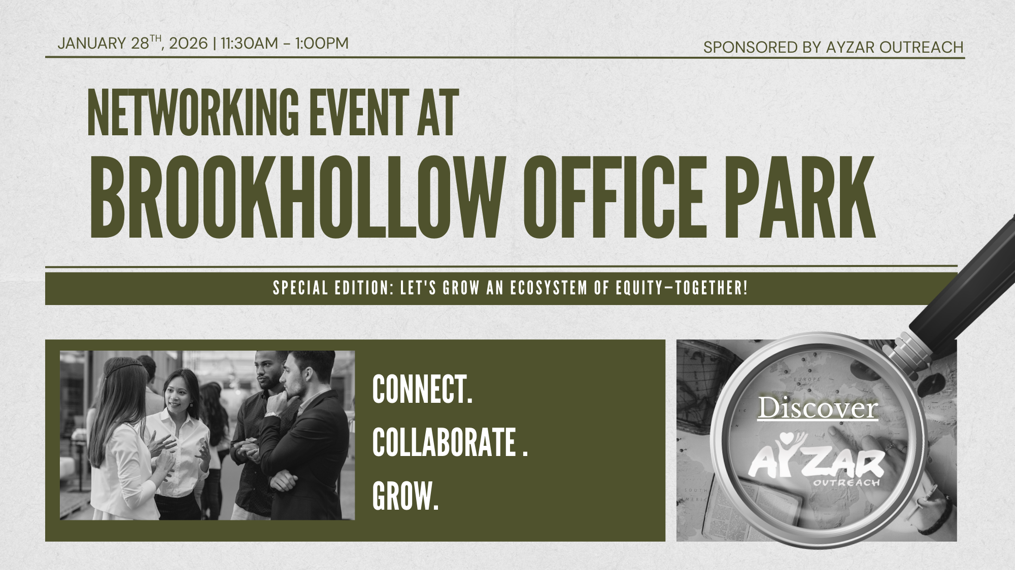 Join AyZar Outreach and the Brookhollow community for a networking event focused on connection, collaboration, and expanding access to opportunity. This gathering brings together Brookhollow businesses, The VA, and IVC workforce to strengthen relationships and explore meaningful ways to support career development.